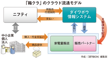 「箱クラ」で提供するパッケージは、ニフティと再販売代理契約を結んだ大手流通卸のダイワボウ情報システム(DIS、野上義博社長)を経由し、DISの二次店である全国の訪問販売系の販社を通じて企業や個人へ販売する。試用期間中の販売額と月額課金制に移行した後の毎月の利用料金は、DIS、販社、ISVに分配する。将来は、家電量販店での展開も視野に入れている。