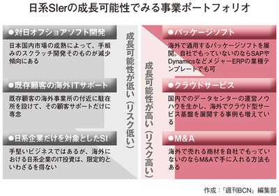 海外進出する日系SIerの現行ビジネスのなかから、成長可能性が高い事業と、そうでない事業を分けてみた。成長につなげられる可能性が高いのは、(1)パッケージソフト(2)クラウドサービス(3)M&Aだろう。いずれも先行投資を伴うリスクがあるのは承知のうえだ。逆に、そうでない事業は(a)対日オフショアソフト開発(b)既存顧客の海外ITサポート(c)日系企業だけを対象とするSIだと本紙ではみている。(b)は、ユーザー企業の進出先の近くに駐在所を設けて、その顧客のサポートだけに専念する。(c)は海外で新規に日系顧客を開拓する手法である。過去20年余り、多くの日系SIerはまず(a)から始まって(b)へと進み、少し余力が出てきて(c)を手がけている段階ではないだろうか。