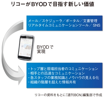リコー(三浦善司社長)は今年9月、BYOD(個人端末の業務利用)を開始した。リコーはこの10年、「個人情報保護法」の施行などによってコンプライアンス(法令遵守)を徹底し、セキュリティ強度を高めて情報を守る体制を強固にした。だが、そのことでITの利便性を失った。今年4月に就任した情報システム部門のトップは、犠牲になったITの利点を取り戻そうと、IT環境と利用方法の見直しに動いた。そのファーストステップがBYODだ。