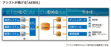 小野課長は、InfiniDBによって「ビッグデータを切り口にビジネスを拡大しようとしている販売パートナーを支援することにつながるのではないか」とみている。アシストでは、ユーザー企業が情報システムを有効活用するための概念としてデータを「つなぐ」「貯める」「生かす」の三つの視点で捉えた「AEBIS(アシスト・エンタープライズ・BI・スイート)」をコンセプトとして掲げている。「InfiniDBは、『貯める』という分野で重要な役割を果たすことになる」とアピールする。年内には販社を通じて10社のユーザー企業を増やすことによって、チャネル体制の確立を図っていく方針だ。