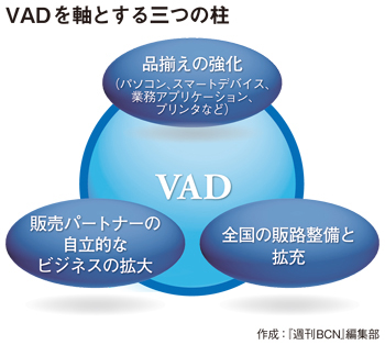 主要3VADのうち、どのVADから商品を引くのかは、販売パートナーが決める事柄であって、流動的な側面がある。例えば、従来はNI+Cから商材を引いてきた日本オフィス・システム(NOS)は、2012年に兼松エレクトロニクス(KEL)の連結子会社となり、しかもKELが東京日産コンピュータシステムとともに、トッパンエムアンドアイのグロスディー設立の出資会社となったので、必然的にグロスディーから商材を引くことになる。ほかにも「水面下で販売パートナーの誘致合戦が繰り広げられている」(VAD関係者)と、商流再編に伴う主要VADの勢力図が塗り替えられようとしている。