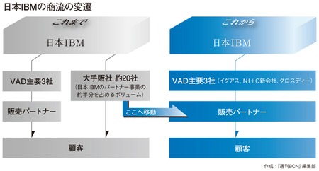 日本IBMは、販売店との直接取引を年内で終わらせる。年明けから、原則として主要VAD(付加価値ディストリビュータ)3社を経由して商材を卸す商流に切り替える。これによって主要VAD合計の売り上げは単純計算で倍増する見通しで、VADの規模を拡大させることでIBM製品のシェア拡大につなげるのが狙いだ。国内VADは米国などに比べて規模が小さく、日本IBMが本来想定していた付加価値機能を十分に果たしていない側面があった。これを改めることで、IBM商流の活性化につなげる。(安藤章司)