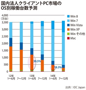 日本では2014年4月9日に、「Windows XP」のサポートが終了する。これに伴って、マイクロソフトからセキュリティの更新プログラムが提供されなくなるので、ユーザーの手元に残った「XP」端末は、ぜい弱性を抱えることになってしまう。つまり、「XP」ユーザーにとっては、クライアント環境の刷新が不可欠というわけだ。しかし、実際のところ、現時点で「XP」からの移行はさほど進んではいない。調査会社のIDC Japanによると、2013年6月末時点で、法人市場の「XP」端末の稼働台数は全体の30.5%。サポート終了まで残り1年を切っているにもかかわらず、約1080万台の「XP」端末が残っているというのだ。さらに、IDC Japanでは、サポート終了後の14年6月末にも法人のPC稼働台数のうち10.3%、371万台の「XP」端末が残るとみている。