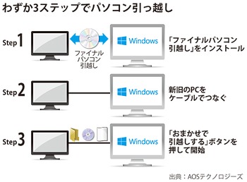 「ファイナルパソコン引越し9plus」は、国内で累計500万本を出荷しているパソコン移行ソフトだ。使い慣れたパソコンのデータと環境設定をわずか3ステップで新しいパソコンに引っ越しできる。まず、古いパソコンと新しいパソコンに「ファイナルパソコン引越し」をインストールする。次に、LANクロスケーブルや専用のUSBケーブルでそれぞれのパソコンを接続する。最後に、「おまかせで引越しする」ボタンをクリックすれば、マイドキュメントやマイピクチャ、マイミュージック、デスクトップ上のファイル、メール、ユーザーアカウント、アドレス帳、環境設定など、ソフト以外のデータや環境設定を、新しいパソコンのOS環境に適した場所に自動で振り分けて引っ越しできる。引っ越し後には、レポートを打ち出して、どんなファイルを引っ越ししたのかを簡単に把握することが可能だ。菱洋エレクトロシステム情報機器営業第1本部営業第2部営業第1グループの河原崎正人主任は、「手作業で移行した場合と比べて、パソコン1台あたり約12時間の時間を短縮し、7万円のコストを削減することができる」と説明する。