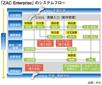 内製を諦め、パッケージソフトの導入に舵を切った後、中根部長はニーズを満たす製品を探して情報収集の日々を送ることになる。そんななか、展示会で出会い、採用に至ったのが、オロのクラウドERP「ZAC Enterprise」だった。労務費、さらには外注費、販売管理費を主な原価とする広告業やコンサルティング業などのサービス業に特化したプロジェクト管理機能をもつ、ユニークなパッケージだ。財務会計や人事給与のモジュールはなく、ユーザーの既存業務システムとフレキシブルに連携できるのも特徴だ。