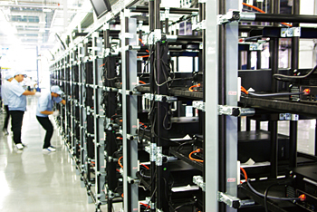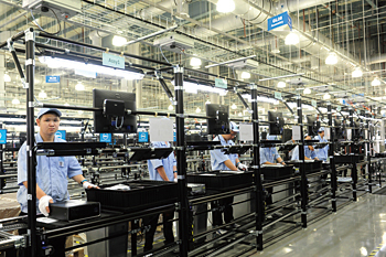 実際の作業現場をみると、生産の流れは、(1)製造に必要な全部品を一つの箱に集約(2)部品をきょう体に組み込む(3)正常に稼働するかどうかをテスト(4)梱包(5)仕分け──の5工程に分けられていることがわかる。一連の作業が一つのラインで動かされ、20人程度のスタッフが手分けして作業する。一人または少数の人数で製造する「セル生産方式」とは一線を画している。1台のPCをつくるのにかかる時間は、1時間から1時間半だ。生産したデスクトップPCの出荷先は、米国と欧州、そして中国。成都を出て上海から船で輸送され、ユーザーの手元に届く。