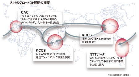 KCCSやCACのように国内外でM&A(企業の合併と買収)を行い、グローバルに打って出る手法は、国内SIer最大手のNTTデータが率先して実行した。その成果が具体的に出始めていることも、今の日本の情報サービス業界に少なからぬ影響を与えている。NTTデータは、年商約5億9100万ユーロ(約820億円)のスペイン・エヴェリスグループのグループ化などM&Aを積極的に展開しており、2016年3月期の海外売上高3500億円の目標を1年前倒しで達成する可能性があることを明らかにしている。