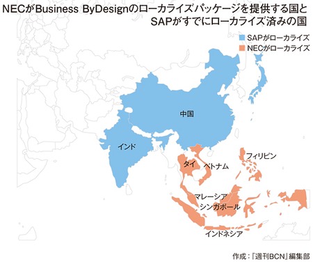 NECが、「NEC Global Localization Package for SAP Business ByDesign」を展開するのは、シンガポール、マレーシア、タイ、インドネシア、フィリピン、ベトナムの6か国だ。この協業は、SAPにとっては、「Business ByDesign」を日本企業の海外進出トレンドに対して網羅的に対応できる商材にするための施策となる。一方、NECにとっても、ASEAN地域でのビジネスを成長させる起爆剤になり得る。現時点では、ユーザー企業がこれらの6か国の拠点に「Business ByDesign」を導入する場合、対応製品が「NEC Global Localization Package for SAP Business ByDesign」しか存在しないので、実質的にはNECが「Business ByDesign」のビジネスを独占することになるからだ。ちなみに、こうした協業契約をSAPと結んでいるのは、グローバルでみてもNECだけだという。