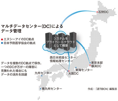 東京・江東区にある本部内に、付属診療所「ウェルビーイング毛利」を設けている。受診者の健康に関わるあらゆるデータを分析し、生活習慣病の予防を徹底していく 採用したのは、日商エレクトロニクスの子会社であるエヌシーアイが提供する「ZETA Cloud Private」だ。北海道・石狩DCのほかに、横浜と大阪にあるDCにシステムのバックアップ環境をつくっている。震災などによって、一つのDCが被害を受けても、データを失うことなく、システムの運用を継続することができる。