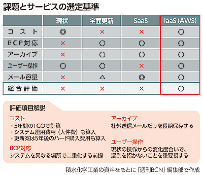 図は、その検討結果だ。現状のスペックでハードウェアを切り替えるのはコストでは優位に立つが、メールボックスの容量増加などの追加要件を満たすことはできない。SaaSはユーザー数が多いために、コストが大幅にアップしてしまう。ユーザーIDの管理も大きな運用負荷となる。IaaSに対しては図にあるように◎の評価がつかなかったが、原部長はIaaSの採用を決断した。総合評価で優位との判断である。