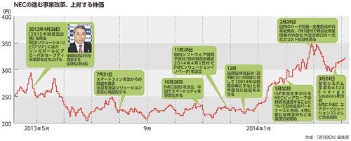 今年1月から、NECの株価がコンスタントに上昇するようになったのは、遠藤信博社長が掲げている「聖域なき再編」が実り始めた成果と捉えることができる。13年7月に発表したスマートフォン事業からの撤退や同年11月に明らかにした国内ソフトウェア開発子会社の統合。思い切って不採算のビジネスを切り離したり、子会社再編によって徹底的なコスト削減を図るという遠藤社長の強い姿勢は、投資家のNECへの信頼回復につながってきているようだ。