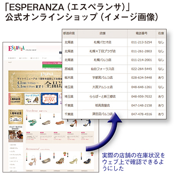 婦人靴をメインに販売する小売事業の「ESPERANZA」の店舗は、北海道から九州までおよそ60店舗を展開し、ネット通販の規模は、同社の中規模店舗ほどの売り上げがある。「ITFOReC」の導入に当たっては、店舗とネット通販の在庫の引き当てを可能にしたり、スマートフォンやタブレット端末での閲覧性を飛躍的に高めるなどしてきたが、最大の特徴は「ネット上で実店舗の在庫状況をチェックできるようにしたこと」にある。