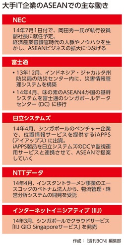 NECや富士通など、大手のIT企業を中心として、中長期的な成長性が魅力のASEAN市場を開拓するための取り組みが活発になりつつある(表参照)。ASEANで成功するためには、現地で売り込むモノやそのための販売体制づくりはもちろんのこと、後方で「人」をうまく活用して、受注の扉を開くやり方が重要な要素になっている。