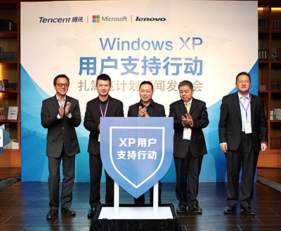 Windows XPのサポートが終了する約1か月前の3月7日(中国時間)、テンセントとマイクロソフトの中国法人(マイクロソフト中国)、レノボの3社は報道関係者向け説明会を共同で開き、「Windows XPユーザーサポート計画」を発表した。OSをアップグレードする前の中国ユーザーに対して、セキュリティ保護およびウイルス対策のトータルサポートを提供するというものだ。マイクロソフト中国によると、テンセントなどの中国ITベンダーは、Windows XPのユーザーに対してサポートサービスを継続しているという。マイクロソフト中国も、中国の各公共機関と協力し、2015年7月14日まではWindows XPユーザーに対してマルウェア対策ソフトの定義ファイルと更新プログラムを提供する。これだけでなく、過去には2013年10月1日から2014年4月8日までの間、政府機関・教育機関のユーザーを除き、中国大陸の中小企業に対して、Windows XPとOffice 2003のアップグレードパッケージを出していた。この期間中にWindows 8とOffice 2013の購入累計ライセンス数が指定値を超えると、アップグレードのサポートサービスやハードウェア製品をプレゼントする施策も展開した。