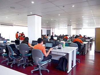 セブ市にあるソフトウェアパーク。多くのIT企業が集まる 一方、1994年設立で従業員数400人の中堅SIerのロココ。同社は2005年に中国に進出し、オフショア開発をスタートした。しかし、中国の政治摩擦と人件費の高騰をリスクと捉えて、2011年にフィリピンに進出。子会社を設けて、現在は20人ほどのフィリピン人が働いている。スタッフの数は中国の開発子会社を上回った。この子会社の責任者を務めるのが、上村一郎ディレクターだ。「東京本社が獲得する案件の量にもよるが、早く3ケタまで人を増やして、オフショア開発の一大拠点にしたい」と意気込んでいる。