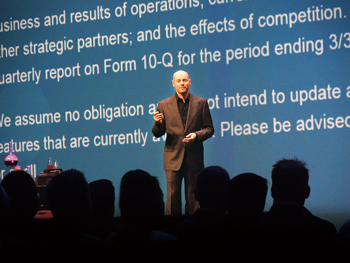 人気ドラマをパロディ化した動画を流す演出も ●R&Dのスタッフもグローバルで拡充 2日目には、ネットスイート創設者の一人であるエバン・ゴールドバーグ会長兼CTOが基調講演を行い、ネルソン社長が発表した機能強化に関する技術的な詳細情報や、技術開発のロードマップなどを解説した。冒頭、米国の人気テレビドラマシリーズ「Breaking Bad」をパロディ化したオリジナルの動画を放映。「ネットスイート製品は便利で、一度使うとやめられない中毒性がある」というメッセージを打ち出し、会場を盛り上げた。