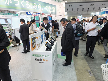 5月に東京で開かれた教育ITソリューションEXPOで「Kindle Fire」が披露された また、独自の拡張APIをもっていて、システム管理者が工場出荷状態にワイヤレスで戻したり、SNSの使用を制限したりすることもできる。現在、富士ソフトは、このAPIを活用して、校内では学校専用のアプリしか利用できないようにする機能など、学校向けの管理機能を開発中だ。これらは、Amazonにとっても、文教市場という新領域で、「Kindle Fire」、ひいてはコンテンツの利用者を拡大するトリガーにもなり得る。