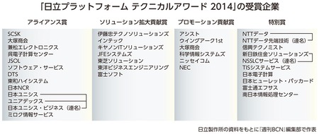 「日立プラットフォーム テクニカルアワード 2014」では、ビジネス拡大に向けたアライアンスを進めたベンダーを称える「アライアンス賞」、ソリューション拡大に力を注いだ「ソリューション拡大貢献賞」、積極的にプロモーションを行った「プロモーション貢献賞」、技術者育成や製品技術の革新などに貢献した「特別賞」などを用意した。その結果、SIerを中心として31組が受賞することになった。