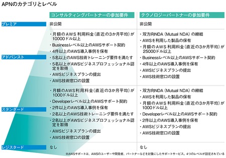 パートナー企業には、「プレミア」「アドバンスト」「スタンダード」「レジスタード」の四つのレベルがある。AWSは通常「スタンダード」以上をパートナーと呼んでいるが、広義では「レジスタード」もパートナーに入る。それぞれに参加要件があるが、「プレミア」については公開していない。ちなみに、日本企業で「プレミア」に認定されているのは、アイレット(cloudpack)と野村総合研究所の2社だけだ。