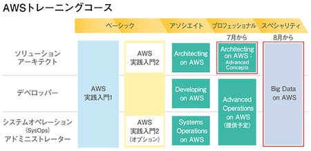 ●ビッグデータ活用のトレーニングコースも登場予定 AWSは、トレーニングプログラムが充実している。これまでは初心者向けが中心だったが、「プロフェッショナル」や「スペシャリティ」という実務者や上級者向けのコースも提供する予定だ。各コースには、APNパートナー向けに優遇制度を用意している。