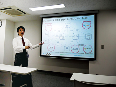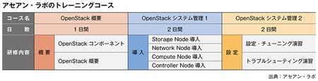 同社が提供するOpenStackのトレーニングコースは、OpenStackプロジェクトの母体となっている「OpenStack Foundation」が承認したオフィシャルプログラムだ。トレーニングコースは、「概要コース」「システム管理1コース」「システム管理2コース」の三つに分かれる。概要コースでは、OpenStackの概要と主要な機能(コンポーネント)を1日かけて学ぶ。残りの二つは応用編として、導入と設定について学ぶ。システム管理1コースではOpenStackや各コンポーネントの導入方法を、システム管理2コースでは各コンポーネントのパラメータの変更やトラブルシューティングのやり方まで、それぞれ2日間で習得する。