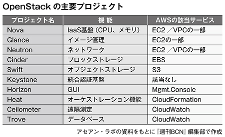 テクニカルな部分で概要コースの核となっているのは、OpenStackの主要機能を開発する各プロジェクトの解説と、GUIを介したその機能の体験だ。OpenStackの主要プロジェクトと、それがAWSではどの機能に該当するのかを上表にまとめた。