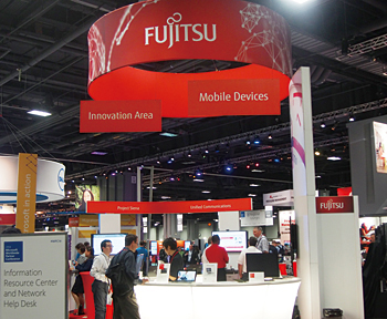 WPC 2014の展示会場に日本のハードメーカーとして唯一出展した 富士通は、WPCの展示会場で日本のハードメーカーとしては唯一の出展。WPCに合わせてタブレット端末の新製品を、通常よりも前倒しのスケジュールで発表した。この点からも、富士通とマイクロソフトが、お互いをパートナーとして重視しているという姿勢を垣間みることができる。