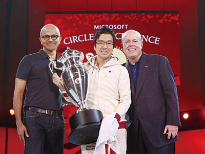 年に一度の社内戦略会議で表彰を受ける日本マイクロソフトの樋口泰行社長。左はサティア・ナデラCEOで、右がケビン・ターナーCOO