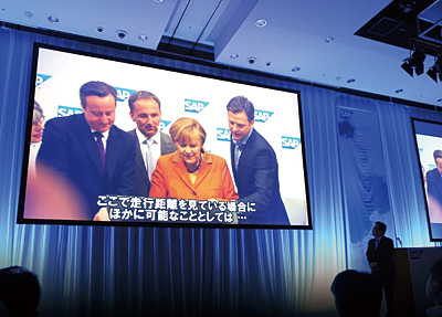 SAPジャパン安斎富太郎社長(当時)の基調講演では、独メルケル首相、英キャメロン首相が、サッカー独代表と英代表の試合を「SAP Match Insights」を通じて振り返るデモを視察している様子も紹介したサッカー独代表を支えたHANA