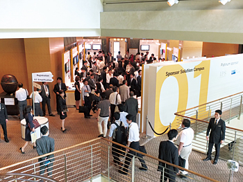 パートナーの展示コーナーも盛況 ここから話を発展させ、「Run Simple」が現在のSAPのキーワードであり、その核となるのがHANAであることをあらためて強調。「単一でオープンなプラットフォームであるHANAを使えば、ERPそのものも超高速化できる」とした。