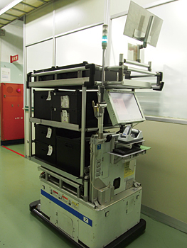 装置の組み立て工程では、熟練技術者とロボットが協力する。まず各組み立て部門に適切な部品を運ぶ役割を果たしているのは、人ではなくロボット。ICカードが埋め込まれた部品格納箱に部品がなくなると、倉庫にその情報が伝わって、部品配送ロボットが起動。適した場所に運ぶ。部品配送ロボットには、人や壁、モノを検知するセンサが組み込まれていて、障害物や人がいる場合は停止するので、事故は起こらない。