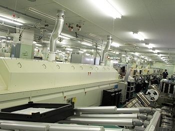 基盤製品は、主に五つの工程を踏む。(1)基盤に部品を実装するための「はんだペースト」の印刷、(2)部品の搭載、(3)「リフロー」というはんだづけと「プレスフィット」と呼ばれる特殊機を用いた部品の固定、(4)検査、(5)パッケージというように進む。この工程で基盤に実装される部品は、約3000点(ハイエンド機種)にもおよぶ。