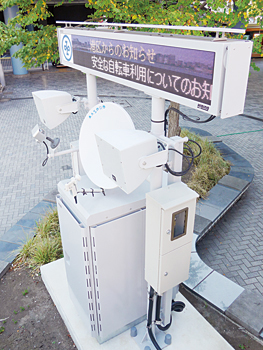 防災ボードは、総務省消防庁が手がける全国瞬時警報システム(J-ALERT)とつながっていて、震災が発生したら、J-ALERTからの情報をリアルタイムに表示する。ディスプレイのほかに、スピーカーも備えていて、文字と音声の両方で注意を呼びかける。これによって、目や耳の不自由な人にも情報が伝わるようにしている。しかし、これだけでは、平常時に表示する情報がない。例えば、自治体がマナー向上のための情報を発信したくても、伝達の仕組みがない。