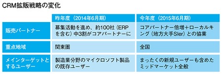 マイクロソフトは、フォロワー(二番手)戦略によって業務アプリケーションベンダーとしての存在感を高めている。日本マイクロソフト(樋口泰行社長)は、CRM(顧客関係管理)、ERP(統合基幹業務システム)をラインアップする「Microsoft Dynamics」事業のリソースを近年大幅に増強し、急成長を実現している。昨年度(2014年6月期)には、Dynamics事業において、各国・地域現地法人のなかで日本マイクロソフトが最も優秀な業績を上げて表彰を受けた。米マイクロソフトも、いまや日本市場をDynamicsの最有望市場と位置づけている。日本マイクロソフトは、こうした追い風を受け、昨年度以上に積極的な拡販施策を展開している。(本多和幸)