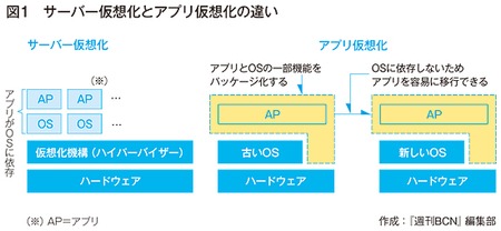 図1は、「サーバー仮想化」と「アプリ仮想化」の違いを示したもの。サーバー仮想化は、ハードウェアとOSの間にハイパーバイザー(仮想化機構)を挟み込むことでハードウェアに依存しなくなるが、OSには依存している。これに対して、アプリ仮想化ではアプリとOSの一部機能をパッケージ化するため、OSに依存しない。
