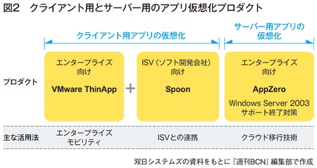 双日システムズは、クライアント用アプリの仮想化として、ThinAppと米Code Systemsの「Spoon(スプーン)」、サーバー用アプリの仮想化として米APPZERO SOFTWAREの「AppZero(アップゼロ)」を取り揃え、アプリ仮想化事業の拡大に取り組んでいる(図2参照)。