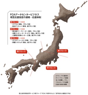 FCAでは、「東ブロック」「中ブロック」「西ブロック」の三つに分けて、それぞれのブロックに「ブロック長」と「副ブロック長」の2~3社の連絡窓口・調整役会社を置いている(図参照)。また、ブロック間の調整機能として「ブロック連絡会」も設置し、これらの会社を軸として相互応援協定に参加する38社の連絡・応援体制を整える考えだ。例えば、「中ブロック」のブロック長は富士通エフ・アイ・ピー、副ブロック長は北陸コンピュータ・サービス、三重電子計算センターとした。「中ブロック」の首都圏、日本海側、太平洋側にそれぞれブロック長(正・副)を配置し、ブロック内のどこが被災しても、同一ブロック内で迅速に支援できるようにした。