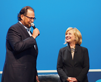 基調講演にはヒラリー・クリントン氏がゲスト出演するシーンも マーク・ベニオフCEOは、「分析機能は使いやすく、データのビジュアル化は驚くほど簡単。まるでゲームをしているような感覚で、楽しくデータをグラフや表にできる」と、2日目の基調講演でアピールした。そして「大半の他社製ツールは、今の時代、つまりスマートフォンで何でもできる環境を想定していないときに開発したレガシーな技術を採用している。私たちは、ユーザーの最新環境に合わせた最新技術を取り入れている」と、他社との違いを強調した。