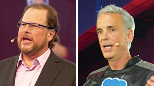 基調講演に登壇したマーク・ベニオフCEO(左)とファウンダーのパーカー・ハリス氏。ハリス氏は特注の衣装で「Salesforce1 Lightning」を説明した新体制の日本法人 目指すは80年代のIBM?