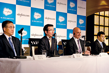 今年4月、セールスフォースの日本法人は、新体制を発表した。左から川原均社長兼COO、小出伸一会長兼CEO、米セールスフォースのキース・ブロック社長兼副会長、宇陀栄次相談役ジョージ・フーCOOに聞くセールスフォースの強さ