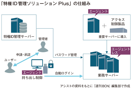 このような課題があることから、アシストは「特権ID管理ソリューション Plus」の提供に踏み切った。このソリューションでは、社内のシステム管理者の承認を得なければ特権IDを利用できないという仕組みを提供する。特権IDの不正利用ができなくなるだけでなく、特権IDと利用者を紐づけることによってセキュリティレベルの向上につなげている。また、利用者が使用するのは自身のIDで、特権IDに自動ログインをさせるため、特権IDのパスワードは流出しない。特権IDで操作可能な範囲を制限できるため、不正利用も防止できる。