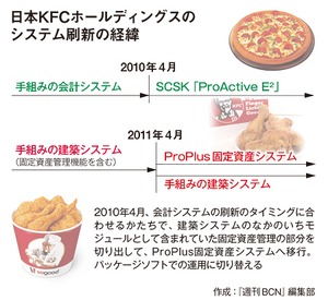 日本KFCホールディングスは、固定資産管理システムを手組みのものから、パッケージソフトへと切り替えた。従来は手組みの「建築システム」のなかに固定資産管理機能を組み込んでいたが、「税制改正のたびに固定資産管理部分を手直ししなければならない」(日本KFCホールディングス情報システムユニットの渡邊敦子氏)ことから、パッケージへの切り替えを決めた。選定したパッケージはプロシップが開発する「ProPlus固定資産システム」。国内外3700社というユーザー数の多さが決め手になった。