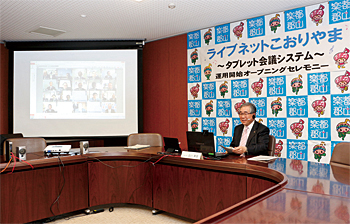 名称は「ライブネットこおりやま」。タブレット端末とブイキューブが提供するウェブ会議システム「V-CUBE ミーティング」を導入して、本庁と市内14か所にある行政センターをつないでいる。品川市長をはじめ、本庁の幹部は定期的に行政センターの職員と会議を開いている。これまでは行政センターの職員が本庁に赴くかたちでその会議が行われた。平常時はいいのだが、地震などによって道路が壊れ、移動ができなくなった際は、本庁と行政センターの間で、お互いの顔を見ながらコミュニケーションをとることができなくなる。そんな事態が起きないようにと、通信環境さえ整えれば、どこからでもリアルにコミュニケーションを図ることができるウェブ会議の採用に踏み切ったという経緯がある。