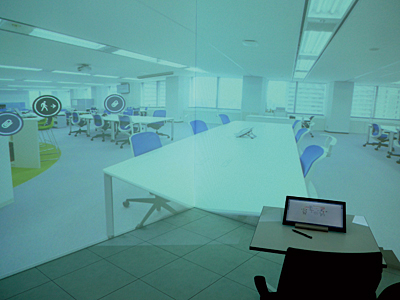 プロジェクションマッピング技術を使い、遠隔地のオフィスをバーチャル空間として再現。まるで同じ場所にいるような感覚で、社員同士でコミュニケーションをとることができる 「そういえば……。○○さん、資料はもうできた?」。東京本社にいる社員が壁に向けて話しかける。壁の“向こう”にいるのは、映像として映し出された大阪オフィスに勤務する同僚。「急いでやるから、もう少し待って」と即座に回答する。二人は同じプロジェクトに携わっており、情報のやり取りを頻繁に行う必要がある。メールや電話だと、話が正確に伝わらなかったり、面倒がってコミュニケーションをとらなかったり……。会話の活性化を阻む障壁はいろいろある。しかし、バーチャル空間をつくり、あたかもコミュニケーションの相手が隣にいるかのような環境を整えれば、離れたオフィスにいても会話が弾むはず。NECネッツエスアイはそう捉え、得意としているプロジェクションマッピング技術を活用して「SmoothSpace」を開発。昨年12月、発売にこぎ着けた。