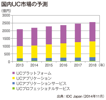 テレビ会議など以前からある製品に加え、「SmoothSpace」のような新型ソリューションも仲間入りして、幅を広げつつあるユニファイド・コミュニケーション(UC)。国内のUC市場は、飛躍的な伸びをみせてはいないものの、着実な成長を遂げている。調査会社のIDC Japanによると、2014年上半期(1~6月)には、前年同期比5.1%増を記録し、1141億円に拡大した。14年の通期見通しは、2192億円と、前年比4.6%の増だ。13~18年の年平均成長率は4.0%とみて、18年には、2554億円の市場規模になると予測している。