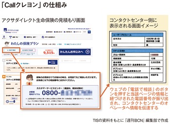 TISの濱本賢一主査(左)と阪本悟主査 具体的には、アクサダイレクト生命保険の見積もりページに「電話で相談」のボタンをとりつけ、見込み客がこのボタンを押すと、見積もりページに紐づく電話番号が画面に表示される。見込み客は、その電話番号を使って問い合わせる。コンタクトセンターのオペレータは、見込み客がどのような見積もりを画面上に出しているのかがわかるという仕組みである。