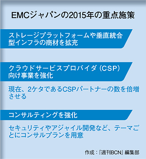 2014年12月に就任したEMCジャパンの大塚俊彦社長は、「プラットフォーム2.5」を基軸にして、ハイブリッドクラウドの環境を構築するためのツールの提供によって売り上げの拡大を図る。「プラットフォーム2.5」とは、オンプレミス(第2のプラットフォーム)からクラウド(第3のプラットフォーム)に移行するにあたって、両方のリソースをうまく活用するためのアーキテクチャや製品群を指す。ちなみにメインフレーム系が「第1のプラットフォーム」になる。15年は、インフラ製品などのポートフォリオを拡充するとともに、クラウドサービスプロバイダ(CSP)との提携を強化して、ニーズが旺盛なハイブリッドクラウド(プラットフォーム2.5)市場の開拓に動く。