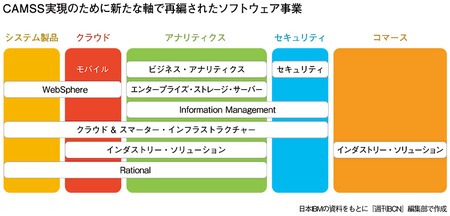 「ハコ売り」からの脱却を目指し、変革の途上にある米IBM。CAMSS(クラウド、アナリティクス、モバイル、ソーシャル、セキュリティ)という五つのトレンドを軸としたソリューションに注力する方針であることを、近年、繰り返し発信してきた。ただ、こうした変革に販売パートナーがついてこれているかといえば、必ずしもそうとはいえない状況であるのも事実だ。そこで米IBMは、まずソフトウェア事業で、いち早くCAMSSを軸にした製品群・ブランドの再編に着手し、パートナーのCAMSSソリューション提案を促進・支援する体制を整えつつある。当然、その影響は日本IBMにも及んでいる。いまだにx86サーバー事業売却の衝撃に揺れている伝統的なIBM販社も多いなか、IBMの新たなチャネル戦略のアウトラインが、ようやくみえてきた。(本多和幸)
