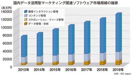 国内市場では、マーケティング関連ツールが伸びると予測されている。調査会社のIDC Japanは、「データ活用型マーケティング」に必要なテクノロジーとして「顧客インタラクション管理」「コンテンツ管理」「コラボレーション/リソース管理」「データ管理/分析」の四つのIT技術領域に分類、「国内データ活用型マーケティング関連ソフトウェア市場」と称して関連するソフトウェアの市場規模を調査した。調査結果によれば、2014年の国内データ活用型マーケティング関連ソフトウェア市場規模は806億3800万円と分析。2015年以降は、電子商取引(EC)の刷新、デジタルマーケティング需要の増加などが見込まれていて、2014~19年の年平均成長率(CAGR)は10.0%で推移し、2019年に1300億9100万円の市場規模にまで成長すると予測している。