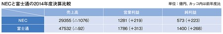 国産大手総合ITベンダー2社の2014年度(2015年3月期)決算が発表された。NEC(遠藤信博社長)は、売上高が前期比1076億円減(3.5%減)の2兆9355億円、営業利益は同219億円増(20.6%増)の1281億円、一方、富士通(山本正已社長)の売上高は同92億円減(0.2%減)の4兆7532億円、営業利益は同313億円増(21.3%増)の1786億円となった。両社とも減収増益で、構造改革が増益につながってはいるものの、売上高は当初計画を下回った。